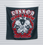 - Black Overload background banner with a red, black, and white "Dixxon Flannel Company" racing flags graphic